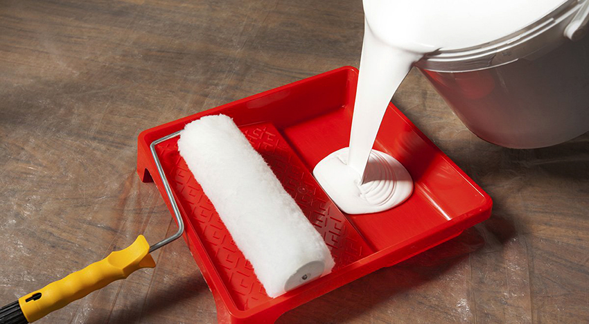 - небольшое количество состава наливают в лоток. С помощью кисти окрашиваются «неудобные» места, которые сложно покрасить другим инструментом. Это зоны, прилегающие к розеткам, трубам, стыки, углы;