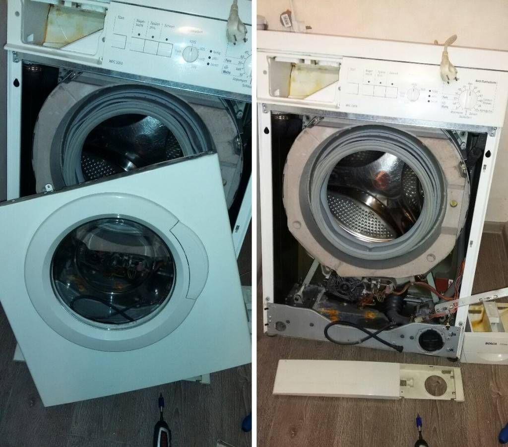 Отключить и убрать прессостат. Выкрутить крепеж, удерживающий блок управления, убрать плату, сфотографировав проводку. Удалив болт, снять реостат. Отсоединить внешний и внутренний хомуты и убрать манжету на дверце люка. Выкрутить шуруп и убрать лоток для моющего средства. Отсоединить патрубки, удерживающие порошкоприемник и трубку от реостата. Удалить ремень, нагревательный элемент, двигатель, температурный датчик. Отсоединить оставшуюся проводку. Отключить шланг от бака к помпе.