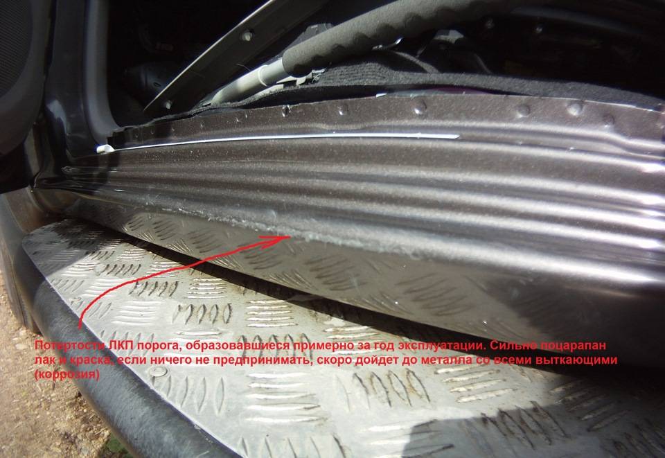 Год назад поставил силовые пороги. Поскольку они выше штатных находятся, очень быстро выявился недостаток — при посадке/высадке каблуками царапаются пороги самого автомобиля. Причем царапаются очень хорошо, за год эксплуатации они оказались исшарканы полностью по всем 4-м проемам (см. фотографию ниже). Заметно становится только при мойке, т.к. большую часть времени они под пылью находятся на не самом видном месте. Качество покраски образу внедорожника вообще не соответствует. В принципе об этом писали и я читал до покупки машины, но все равно неприятно, не думал я, что все настолько запущено.
