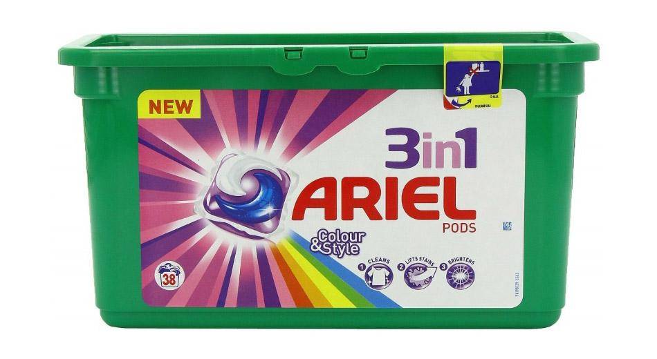 Ариэль в капсулах предназначен для удаления загрязнений любой сложности. Сами капсулы состоят из трех секций, в которых размещены средство для стирки, пятновыводитель и усилитель яркости. При этом фиксированного количества веществ, содержащихся в одной капсуле, хватит на любую стирку, что позволяет не высчитывать нужное количество порошка.