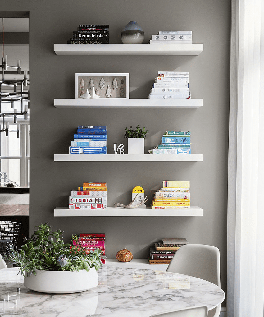 Если полки предназначаются для книг, то купите красивые обложки в одном цвете или в одном стиле. Сувениры, горшки для домашних растений, бюсты должны перекликаться с основной концепцией дизайна. Например, романтичный декор будет неуместен в интерьере в стиле хай-тек, а разномастные подсвечники в куче с разноцветными фоторамками будут создавать визуальный шум и ощущение захламленности