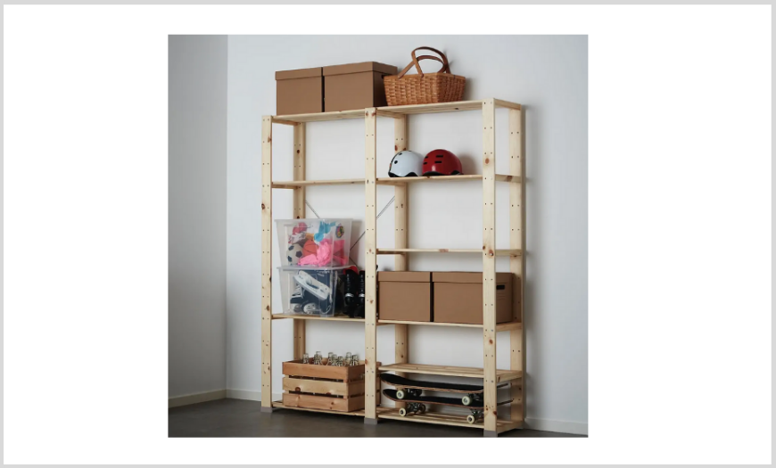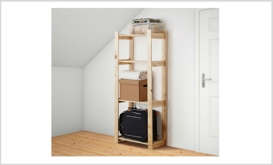 Сюда очень хорошо подойдут деревянные стеллажи от икеа. Они многофункциональны и весьма удобны. На полках легко размещается кухонная утварь, всевозможные вещи, которые пока не требуются в обиходе, массивные одеяла, подушки, постельное белье в ящиках, журналы, книги, всевозможные баночки и баллоны, припасы. Все на виду и всегда под рукой.