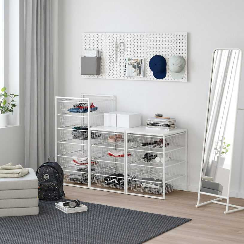 Лаконичный интерьер комнаты для подростка с металлической кроватью Икеа легко оживить. Ощущение теплоты создаст обычный деревянный шкаф-купе, если его поставить рядом со спальным местом. Оригинально выглядят комбинации, составленные из модулей разных линеек. Динамику вносят, играя объемом и цветом элементов.