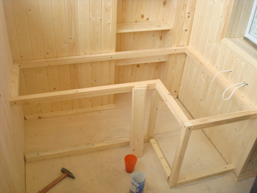 Этап 3. Внутреннюю часть нужно обшить ДСП, или же фанерой соответственного размера. В щелях между досками, или брусьями крепится утеплительный материал, затем монтируется внешняя обшивка.