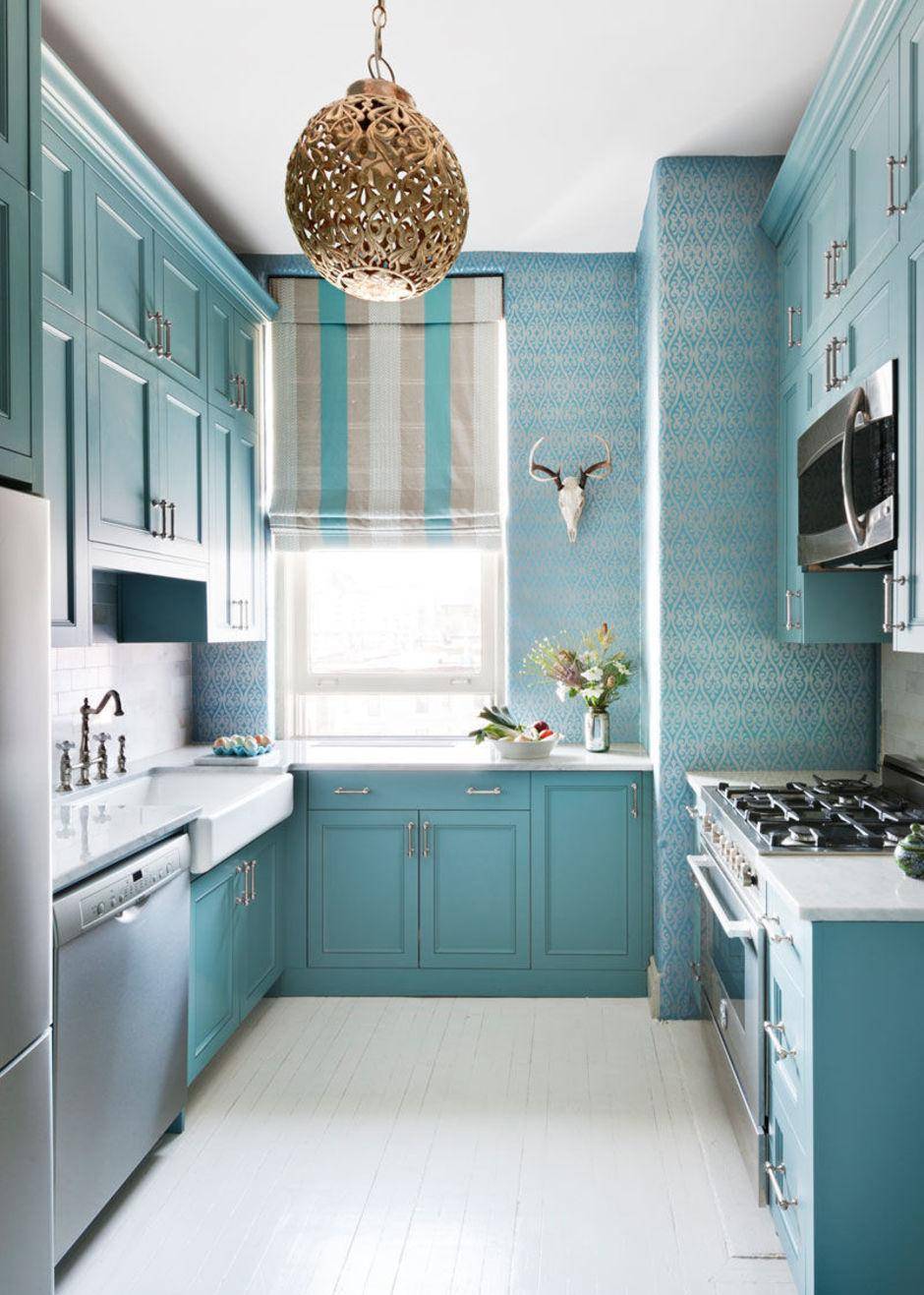 Стандартные кухни не могут похвастаться избытком площади и этот момент необходимо учитывать при оценивании сине-зеленой палитры. Визуально добавят пространства светлые оттенки. А в просторных кухнях бирюза любого тона будет выглядеть органично.