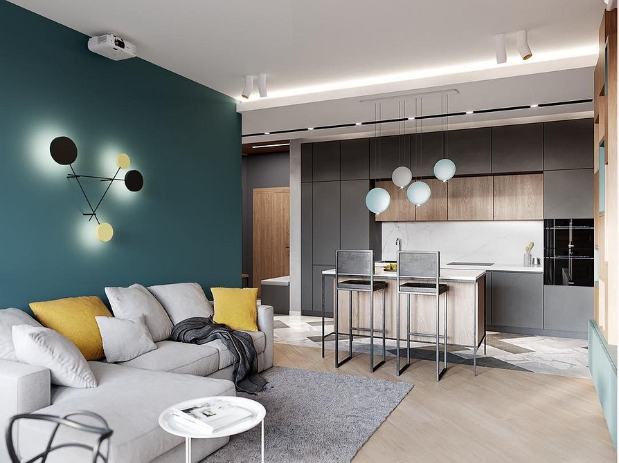 Популярный тренд – отделка одной стены ярким декором, который будет оригинально выделяться на общем фоне интерьера. При этом остальные поверхности оформляются в нейтральные тона, чтобы не перегружать пространство. Бирюзовый цвет выглядит довольно активно. Чтобы сделать интерьер более легким, его сочетают со светлыми красками: песочная, белая, жемчужно-серая, светлая беж.