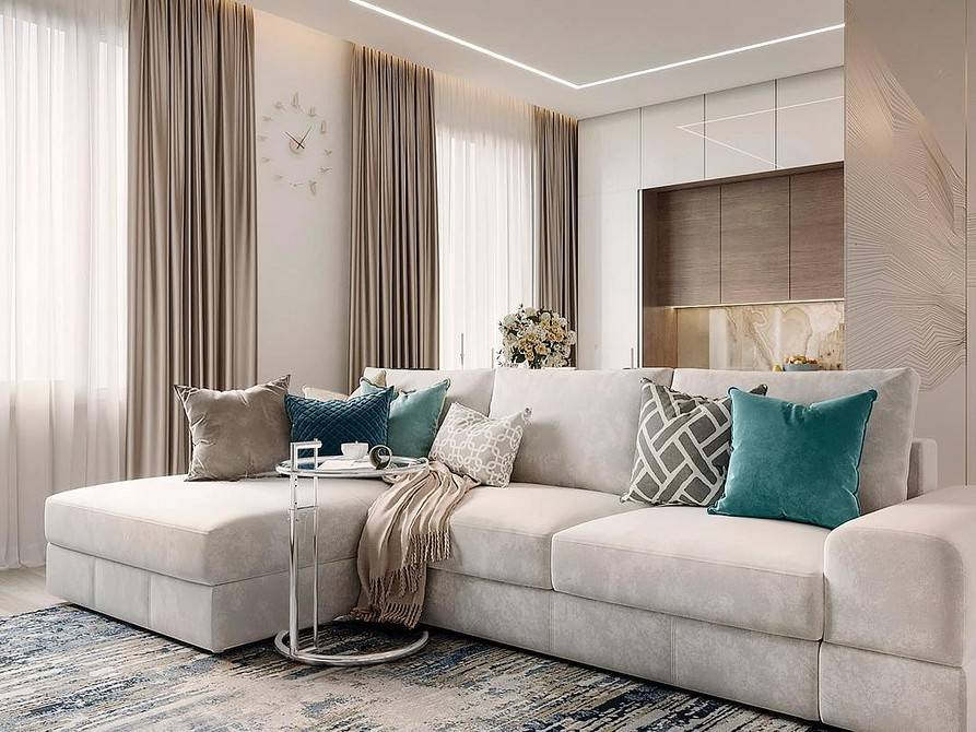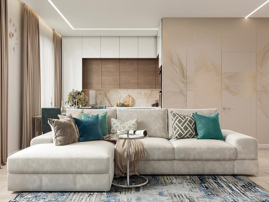 Гармонично сочетание светло-голубых и бежевых оттенков, широко используется в украшениях. Вкрапления яркого цвета эффектно смотрятся на нейтральном фоне, например, бирюзовом диване. Не забывайте текстуры. Дерево сделает интерьер интереснее с точки зрения сочетания материалов и в то же время останется недосягаемым. Таким способом часто оформляют кухонный гарнитур, если комната соединена с кухней.