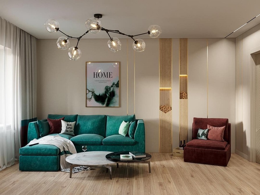 В дизайне надо органично сочетать темно-бирюзовый с другими оттенками. Выигрышная и модная комбинация получается при разбавлении насыщенного цвета оливковыми или горчичными тонами.
