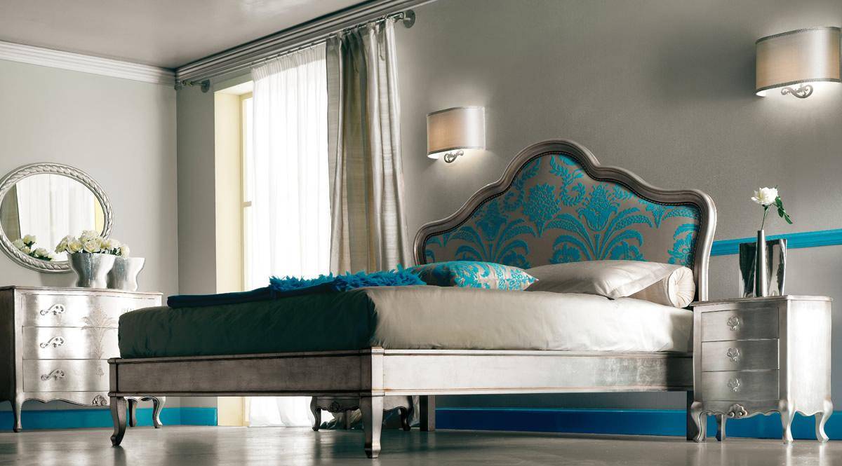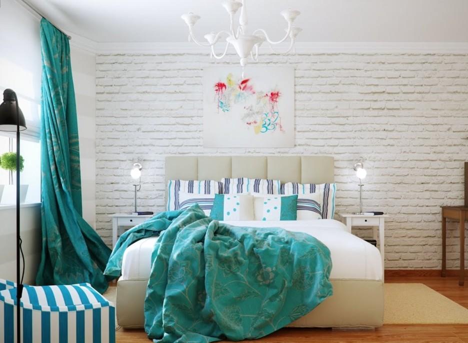 Небесно-голубой оттенок бирюзового в интерьере спальни