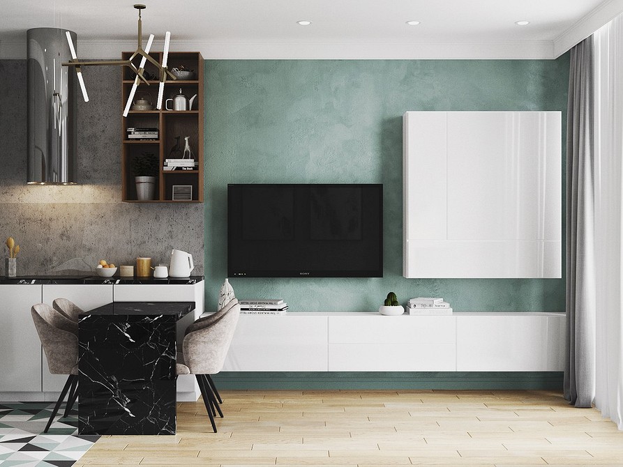 Если все стены сделать сине-зелеными, то желательно выбирать пастельные или даже блеклые тона. При акценте на отделочные материалы, мебель выбирают других оттенков. Стильно смотрятся как белые кухонные фасады, так и темные (практически черные).