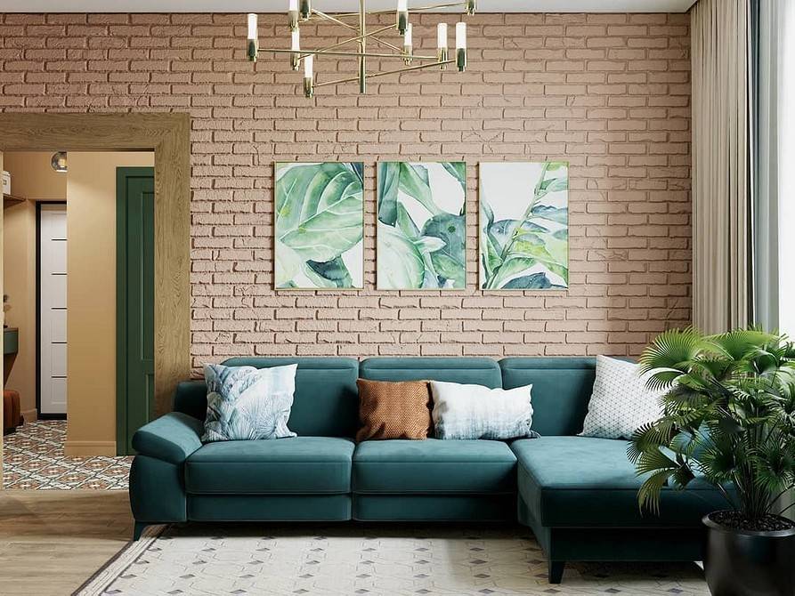один из лучших вариантов для сочетания с бирюзовым оттенком, по мнению специалистов, – это природная палитра. Яркие зеленые, а также желтые, оранжевые, лимонные тона сформируют контрасты на фоне холодного бирюзового цвета, вызовут ассоциации с природой и морским бризом и отлично подойдут для гостиной, спальни, кухни и других интерьеров.