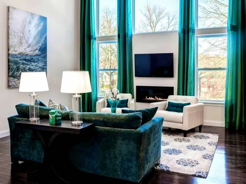 Дизайнеры часто используют контрастные сочетания, например, часто яркую бирюзу с молочно-белой палитрой. Но в интерьере гостиной, помимо бирюзовых тонов, лучше ввести еще одну вращающуюся цветовую схему средней яркости. В противном случае бирюзово-белая пара может вызвать ассоциации с ванной.