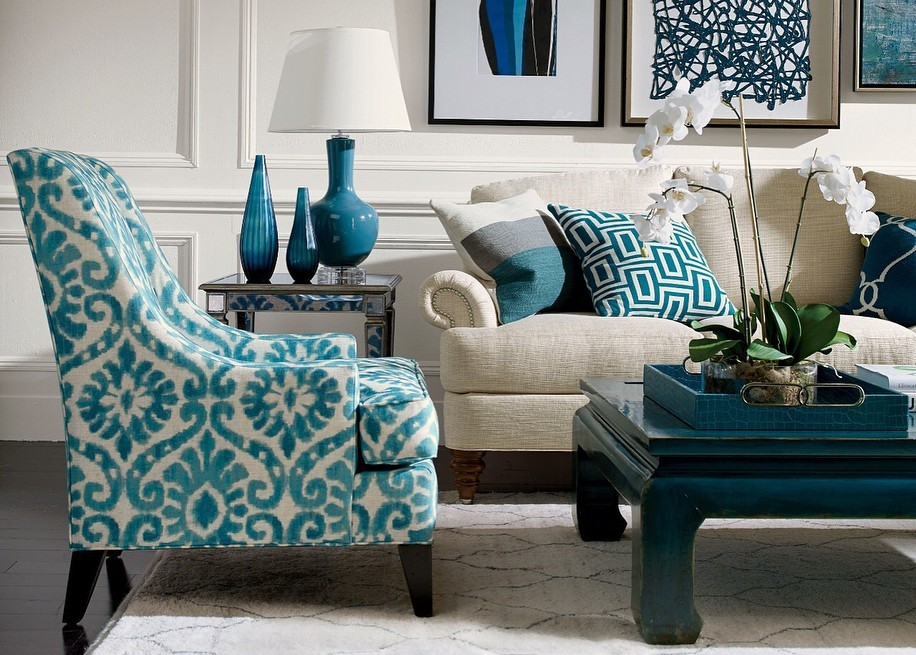 Бирюзовыми могут быть только яркие аксессуары в гостиной. Причем, это не обязательно будет декор: один старинный сервант в сочетании с лазурным узором на диванных подушках и шторах – идеальное гармоничное решение. Так же будет смотреться диван с парой крупных ваз в классической обстановке. Порой всего пара деталей задают настроение и характер огромному пространству.