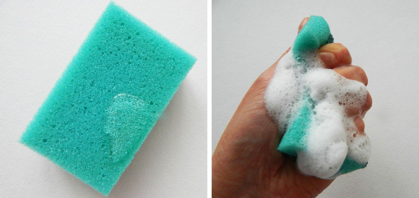- Маленькое количество геля (жидкости) нанести на губку, взбить пену, тщательно удалить загрязнения с поверхности и прополоскать чистой проточной водой;