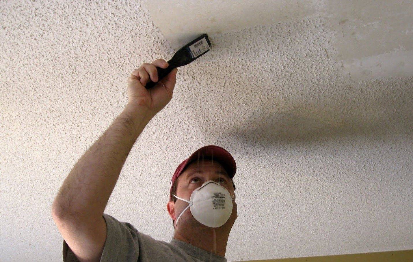 После этого приступаем к работе. При помощи широкого шпателя сдираем пенопластовые изделия с потолочной поверхности, начиная с угла комнаты. Для работ в труднодоступных местах используем узкий шпатель. Пенопласт ломкий материал, который имеет свойство прилипать ко всему вокруг, поэтому защитная одежда и очки будут не лишними.