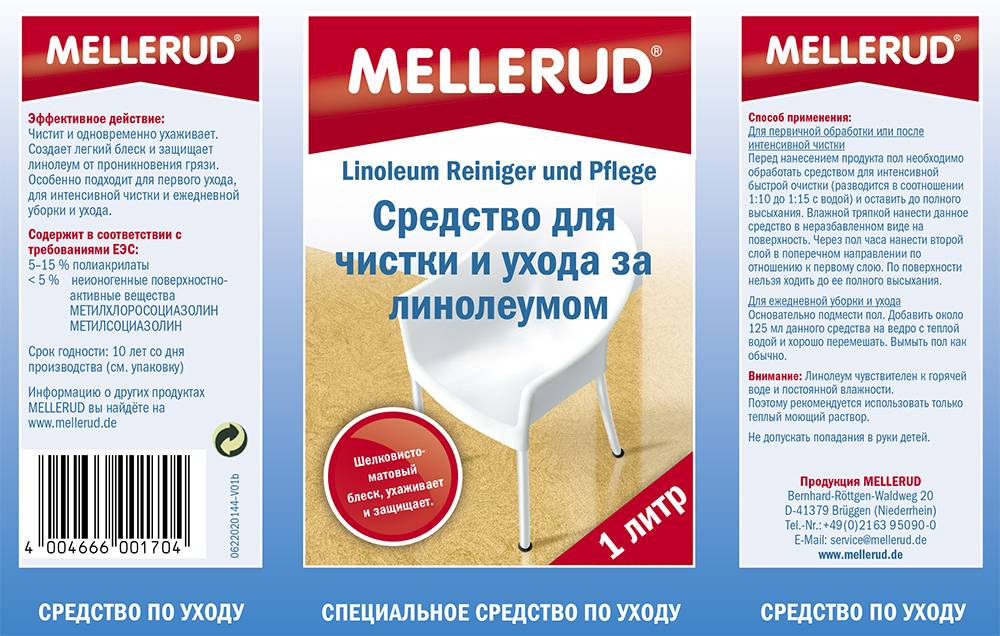 Mellerud – чистящее средство от пятен на поверхностях из линолеума. Препарат использовать в концентрированном виде.