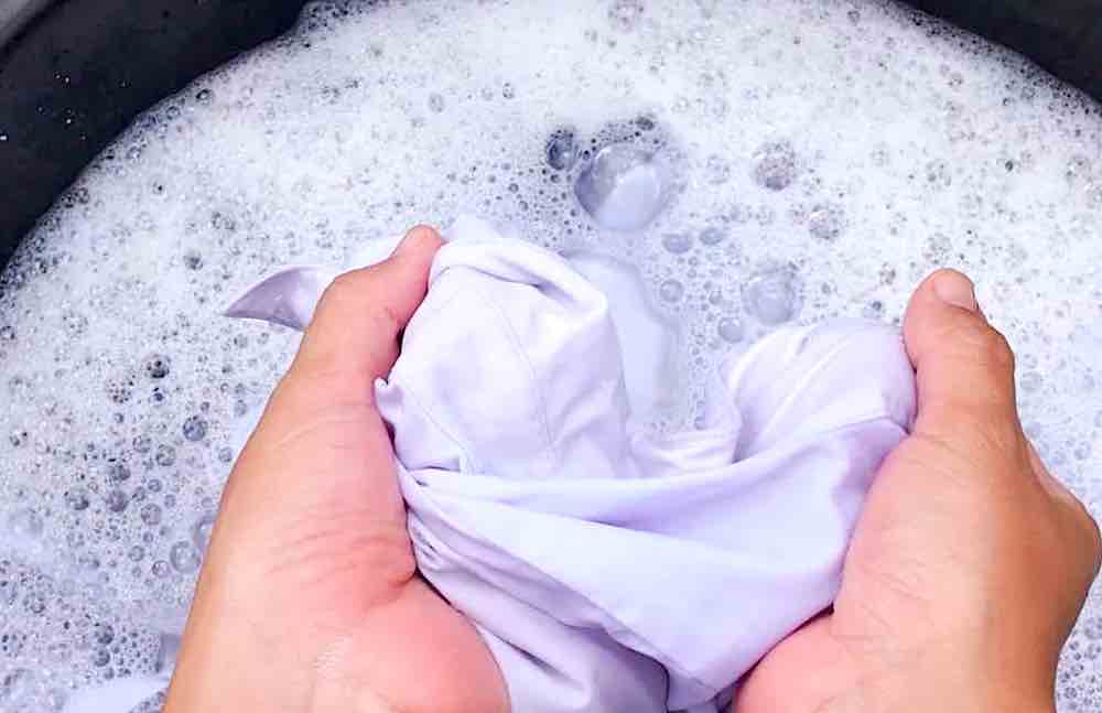 В тазу с водой растворяют средство, вспенивают жидкость и замачивают одежду.