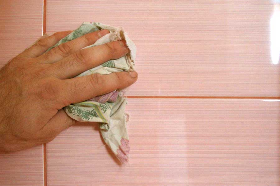 Как аккуратно ни затирай швы, все равно часть материала попадает на поверхность плитки и его впоследствии нужно смыть. Проще отмывать еще влажную затирку – поверхность можно легко почистить обычной тряпкой, но когда затирка затвердела, придется использовать другие средства.