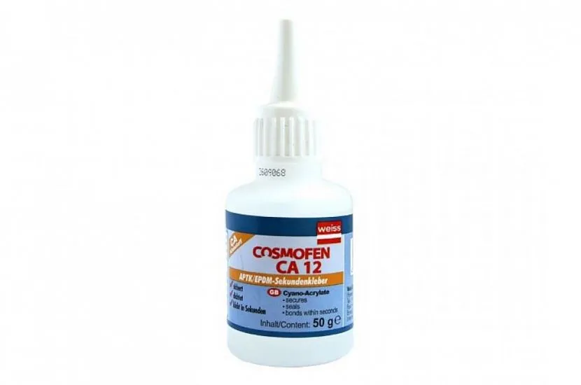 - Клей немецкого производителя Weiss COSMOFEN CA 12 соединяет силикон, керамику, резину, пластик и другие материалы. Он устойчив к ультрафиолетовому излучению, температурным колебаниям, высыхает быстро. В комплекте есть удобный дозатор. Для такого варианта характерна высокая прочность. Предварительно изделия рекомендуется обработать грунтовкой Cosmoplast 588 для лучшей адгезии.
