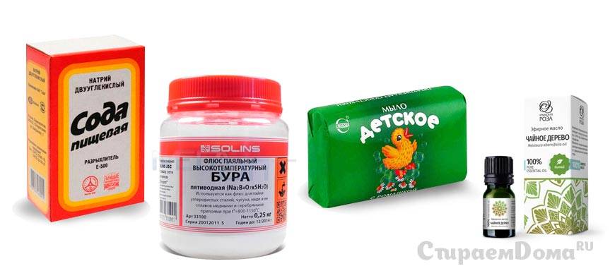| Мыло | Хозяйственное 72% Детское (не содержит вредных добавок) Туалетное (кастильское или глицериновое) | Активно удаляет загрязнения, смягчает волокна ткани |