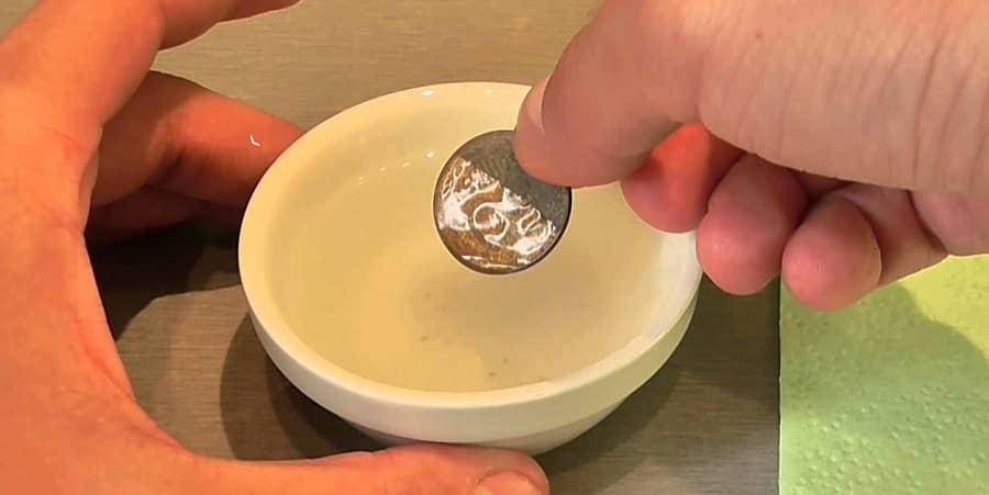 9%-ный уксус уберет ржавчину и зеленый налет. Монету для этого кладут в керамическую посуду, заливают раствором уксуса (1 ст. л) с водой (полстакана) и периодически переворачивают. После полной очистки металл промывают под проточной водой и высушивают при помощи многослойной салфетки. Вместо уксуса можно использовать лимонную кислоту.
