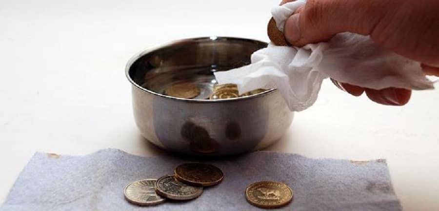 Есть несколько способов, как чистить монеты с помощью уксуса. Сначала изделие моют в холодной воде, протирают столовым уксусом и оставляют на 5-10 минут. Тогда моют повторно, но уже в теплой воде и высушивают.