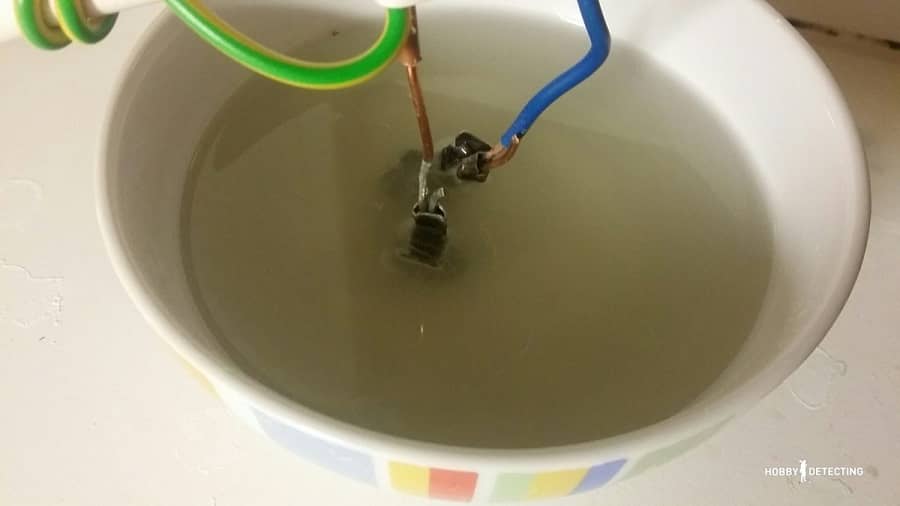 Подсоединенные к выходящим из блока проводам, зажимы подключаются минусом к монете, а плюсом к металлическому предмету. Монета с деталью погружается в солевой или содовый раствор на некотором расстоянии друг от друга. После чего включается блок питания. Процесс очистки может проходить от 40 минут до 4-х часов. Более быстрый, но и опасный для монеты способ, при котором плюс подключается к монете, а минус к металлу.