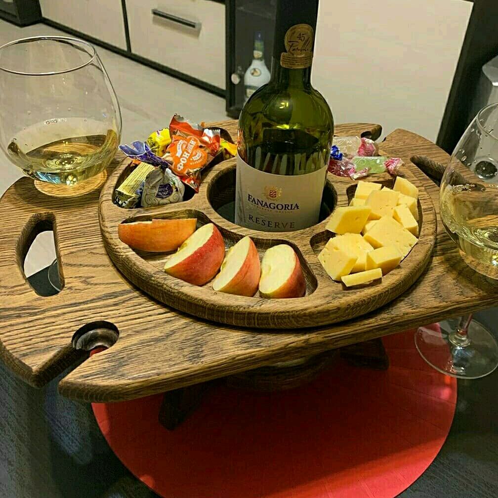 - Винная. Это столик для вин с отверстием для бутылки вина и несколькими – для бокалов. Сама поверхность разделена на секции, в которые можно положить закуску – нарезки, фрукты, орешки. Используется как походный вариант или для романтического ужина в гостиной. Они часто бывают самодельными.