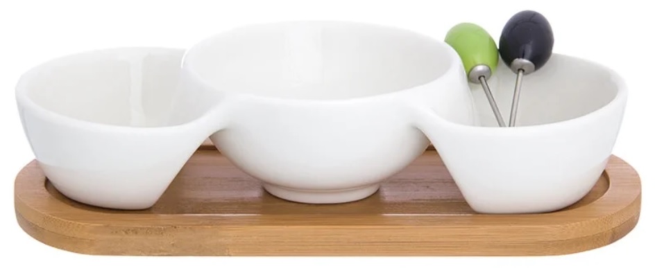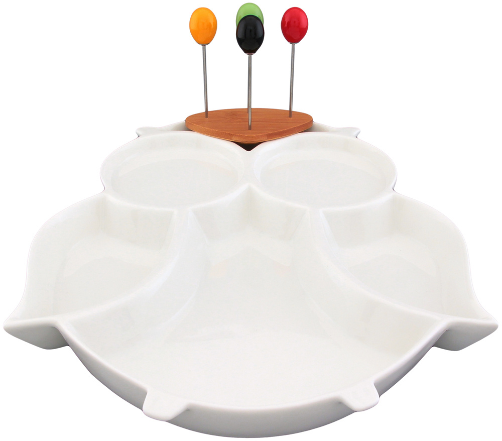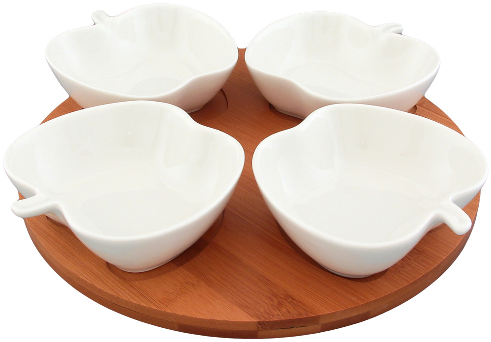 Изготовленная из высококачественного материала эта модель обладает круглой крутящейся подставкой и четырьмя отдельными секциями в форме половинок яблока. Подставка сделана из натурального бамбука. Каждый модуль имеет объем 120 мл, его легко снять с подставки и применять отдельно. Изделие экологически безопасно, а его необычное внешнее исполнение украсит интерьер. Elan gallery «Яблоко» подходит для подачи салатов, закусок, гарниров, а также сладостей и десертов, орешков. Размеры модели составляют – 25 см (диаметр), 6 см (высота). Средняя стоимость – 650 руб.