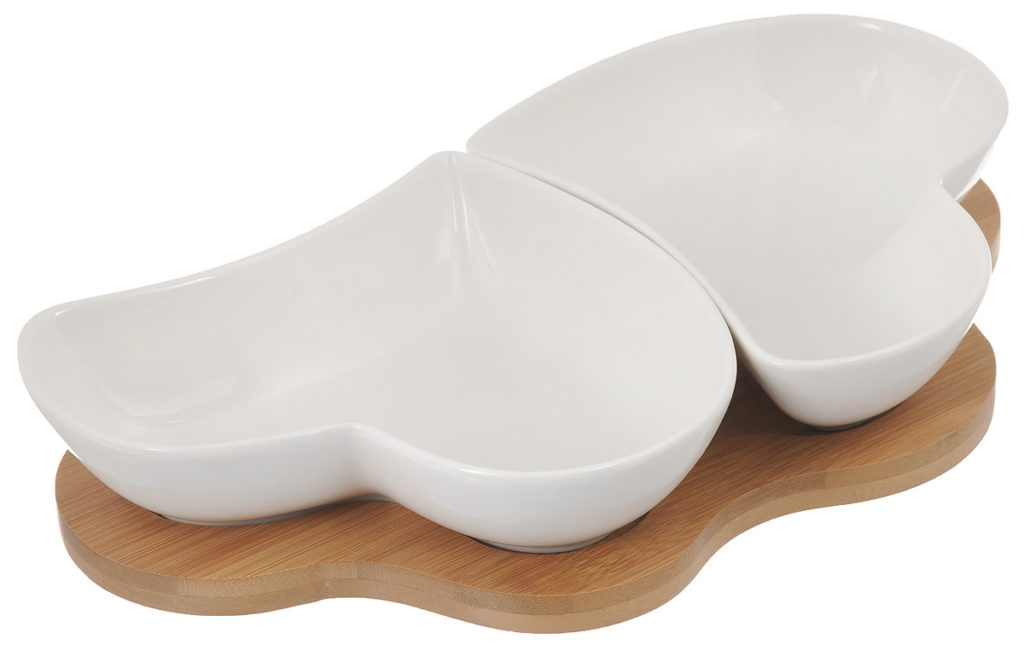 Представляет собой две чашки, имеющие романтичную форму сердца, установленные на бамбуковую подставку. Изделие подходит для большинства видов блюд. Модули легко снимаются с подставки и применяются по отдельности как салатники или вазочки для орешков, сладостей. Elan gallery «Сердце» может применяться в повседневности, а также для украшения праздничного стола. Благодаря своей форме изделие станет приятным романтичным подарком. Габариты предмета – 30 см (длина), 15 см (ширина), 5 см (высота). Средняя стоимость составляет – 681 руб.