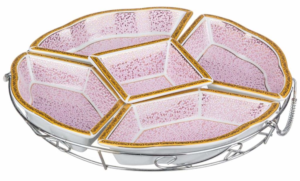 Фарфоровая менажница диаметром 30 см. Обладает круглой формой, дополнена изящной металлической подставкой. Это стильное изделие выпускается в двух вариантах цвета – нежно-голубом и розовом, с золотистой каймой и рисунком в виде сверкающей мозаики. Модель Lefard разделена на 5 отсеков, одинаково хорошо подходит для украшения праздничного стола и повседневного приема пищи. В тарелке подаются различные виды закусок и блюд, соленья, соусы, орешки и другие продукты. Упаковка изделия также отличается красочностью, благодаря чему оно уместно в качестве подарка. Средняя стоимость составляет – 1 728 руб.