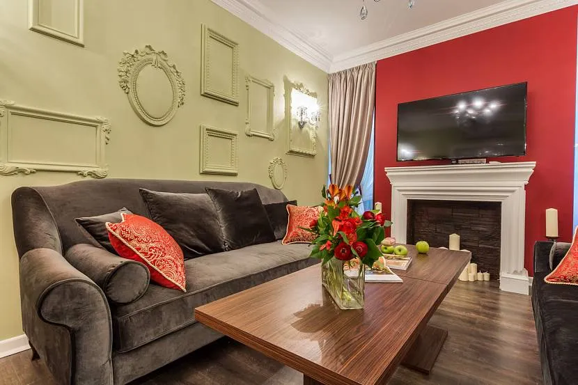 Красная стена в интерьере гостинойИсточник www.upshine.com