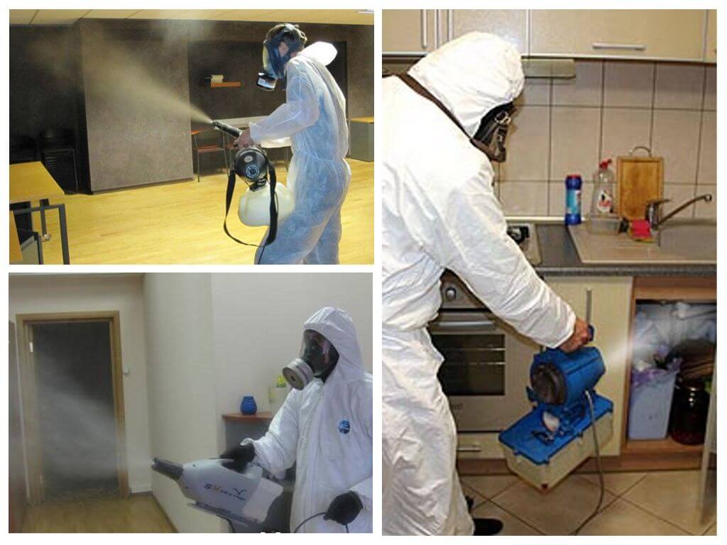 При использовании метода холодного тумана жидкость распыляется в виде очень мелких капель, равномерно покрывающей все поверхности в квартире и проникающей во все щели и уголки