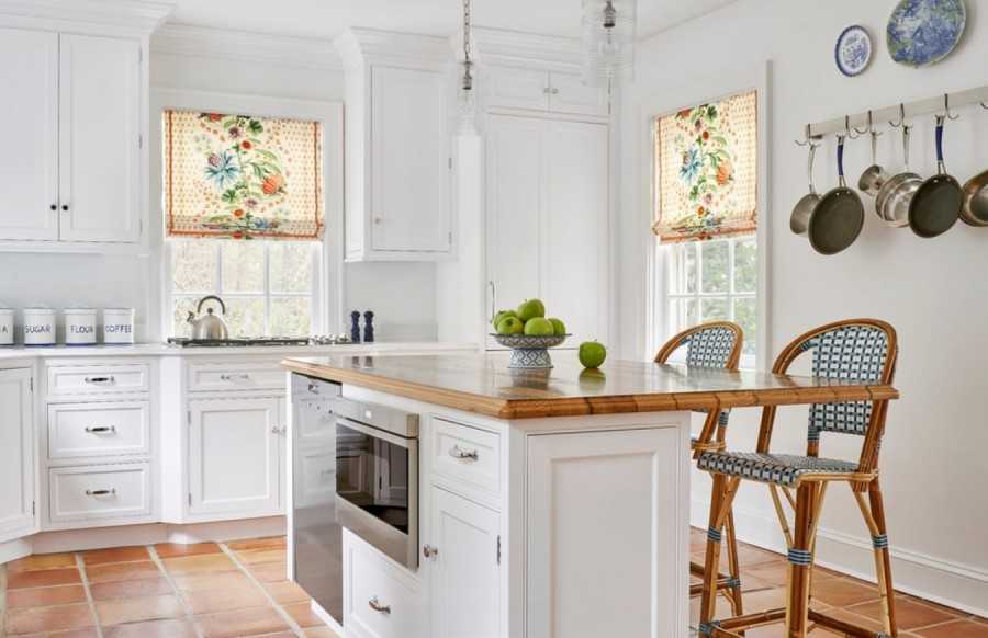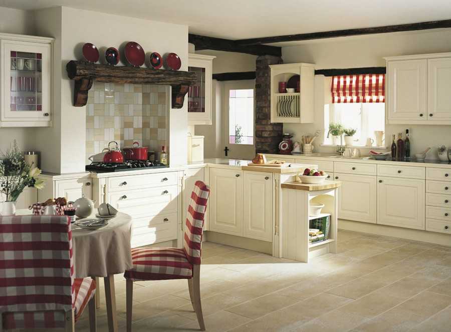 Если же кухня маленькая, то можно в интерьере применить деревенский стиль. Этот популярный стиль подразумевает снятие всех дверок со шкафов, а вместо них весятся небольшие занавески.