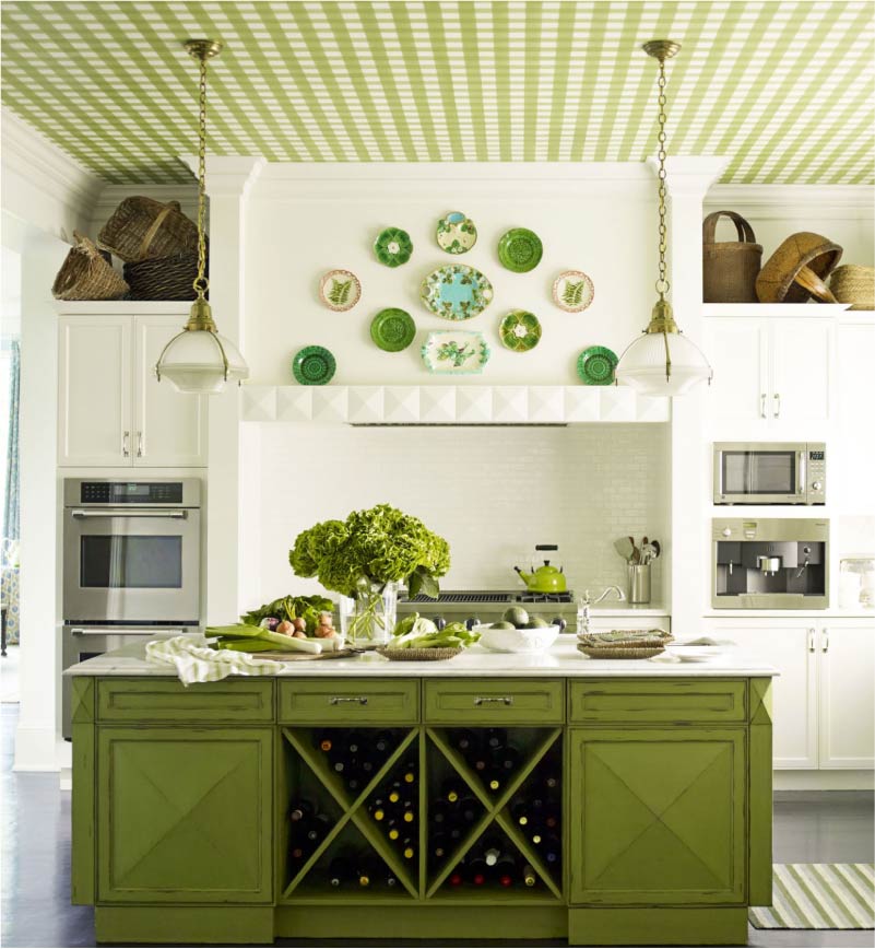 - Отделить обеденную зону на кухне можно с помощью широкой полосы обоев. Наклеивается она в месте, где стоит обеденный стол, и продолжается на потолке ─ над всей зоной для приема пищи. Цвет и орнамент такого акцента зависит от стиля помещения. Для кухни в стиле хай-тек применим более темный цвет, чем основной тон стен. Для классики подойдут обои с крупными цветами или стильной полоской. Для кантри во французском стиле ─ лавандовые нотки с мелким орнаментом, как на фото ниже.