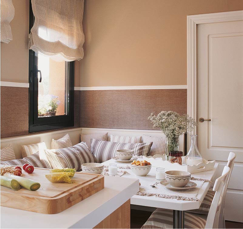 Шторы, а также другие текстильные принадлежности (кухонные полотенца, мягкие сиденья для стульев) следует выбирать в светлых спокойных тонах (подойдут нежные розовый, сиреневый, некоторые тона зеленого, молочный или бежевый оттенки).