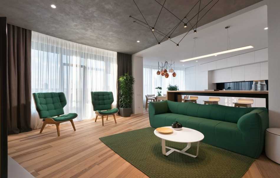Модный интерьер главной комнаты дома в 2022 году разрабатывается по следующим принципам: