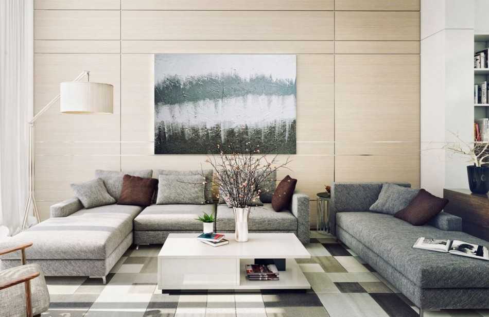 Пол создаёт основу для будущего интерьера. Он подчёркивает стиль гостиной или представляет собой нейтральный вариант, подходящий для любого дизайна. Самым распространённым материалом для зала выступает ламинат или паркетная доска.