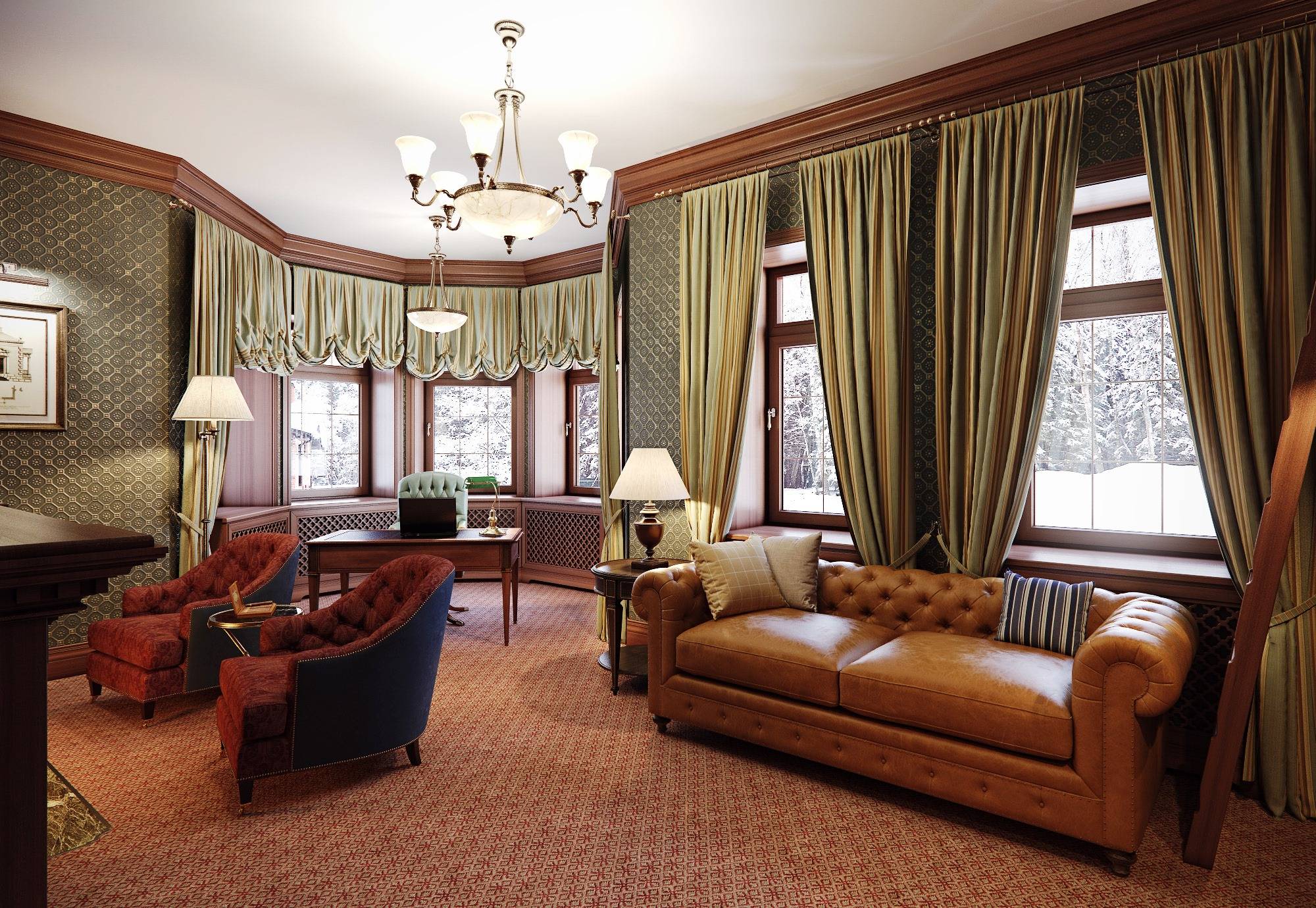Для гостиных чаще используют длинные варианты занавесей. Но могут быть выбраны и короткие, если в помещении располагается зимний сад, библиотека с диванчиками вдоль стены, оборудовано рабочее место с письменным столом.