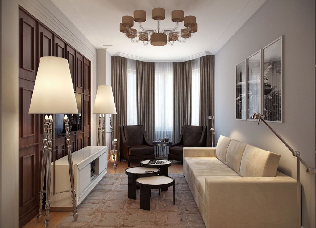 Для гостиных чаще используют длинные варианты занавесей. Но могут быть выбраны и короткие, если в помещении располагается зимний сад, библиотека с диванчиками вдоль стены, оборудовано рабочее место с письменным столом.