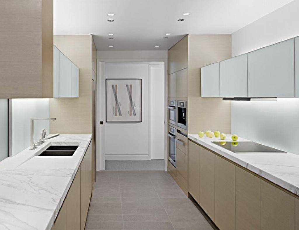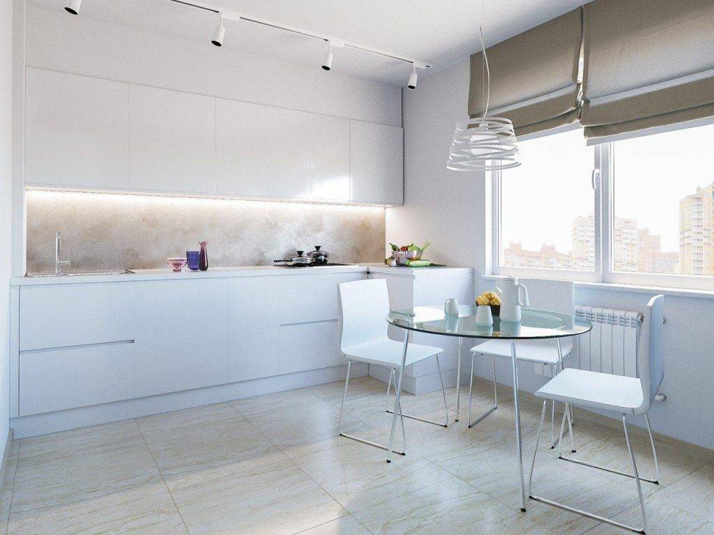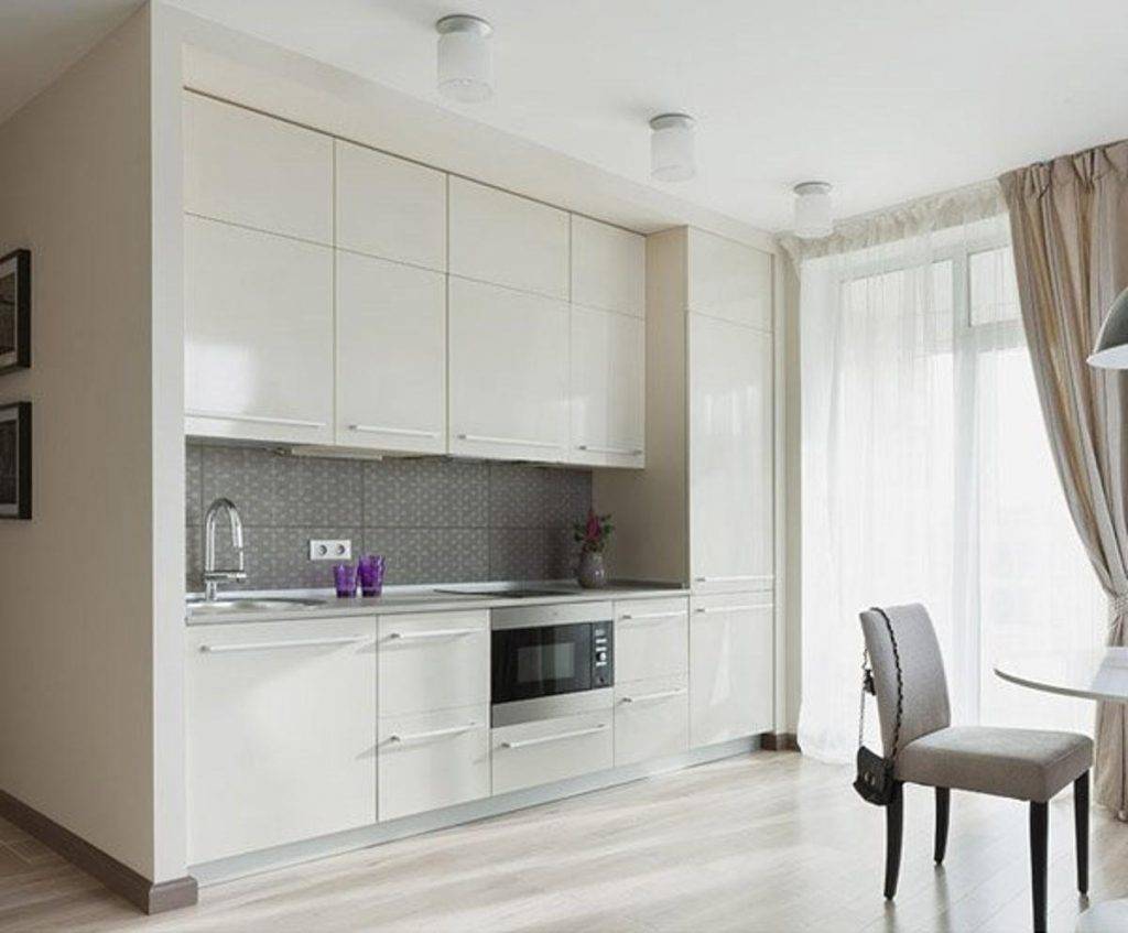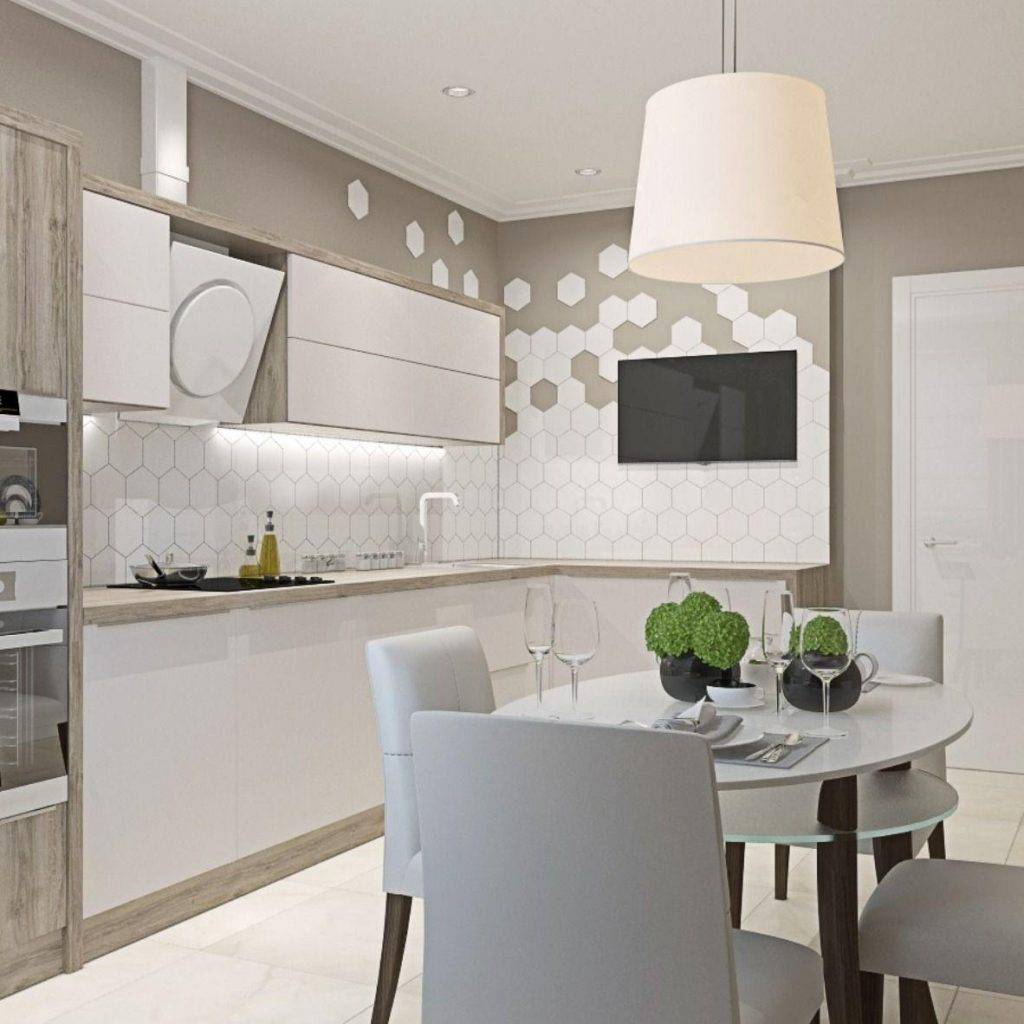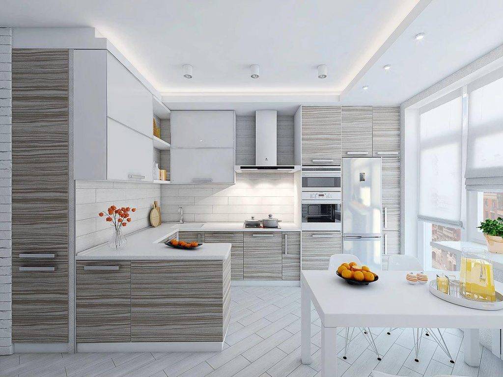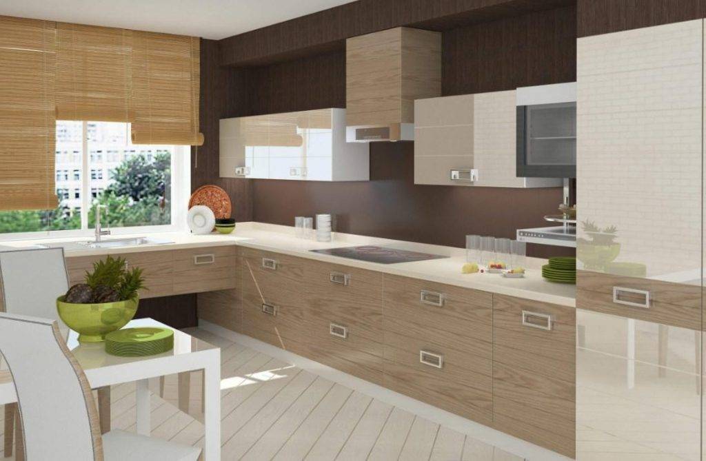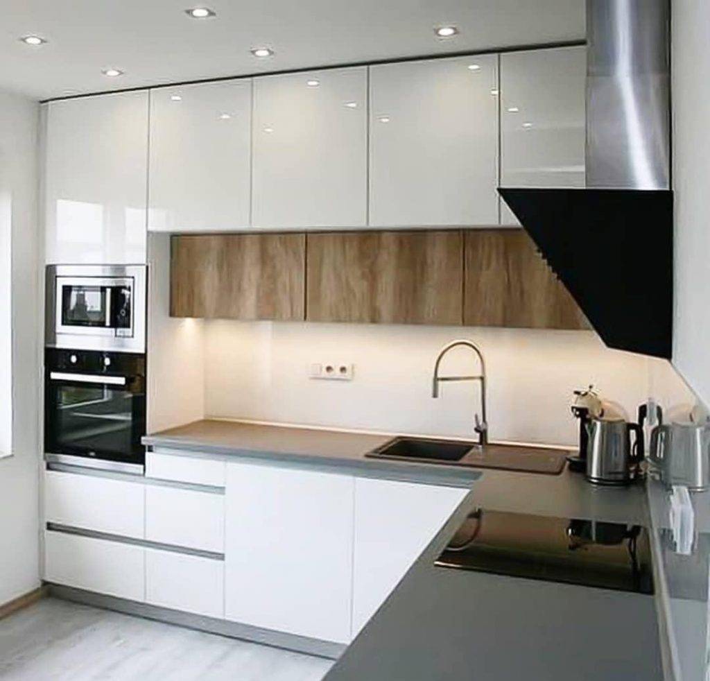 Для гармоничного сочетания рекомендуется использовать светло бежевые или серые оттенки в отдельных элементах интерьера кухни. Например, применить неброский, нежный рисунок в пастельных тонах на белой плитке, которой будут отделаны стены над рабочими поверхностями. Ниже на фото примеры маленьких кухонь с современным дизайном.