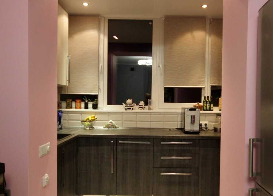 На фото дизайн кухни объединенной с балконом с окнами, оформленными светлыми рулонными шторами.