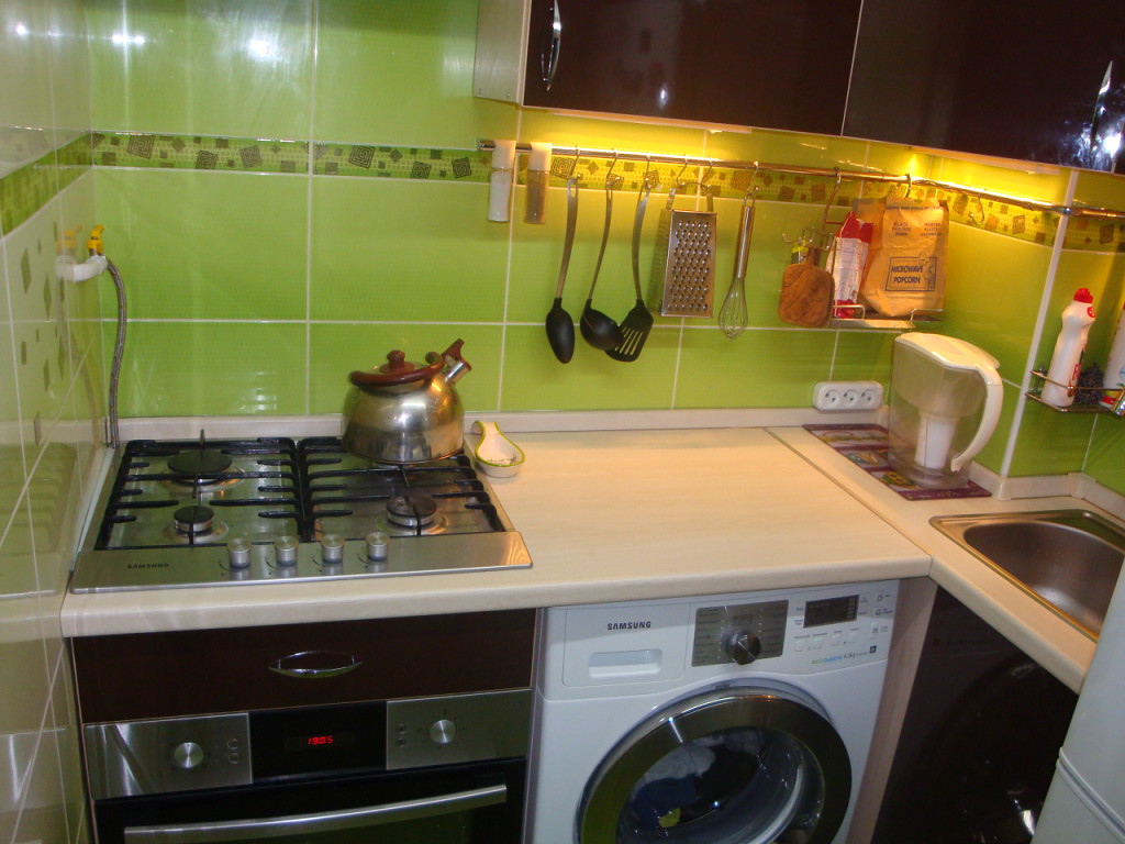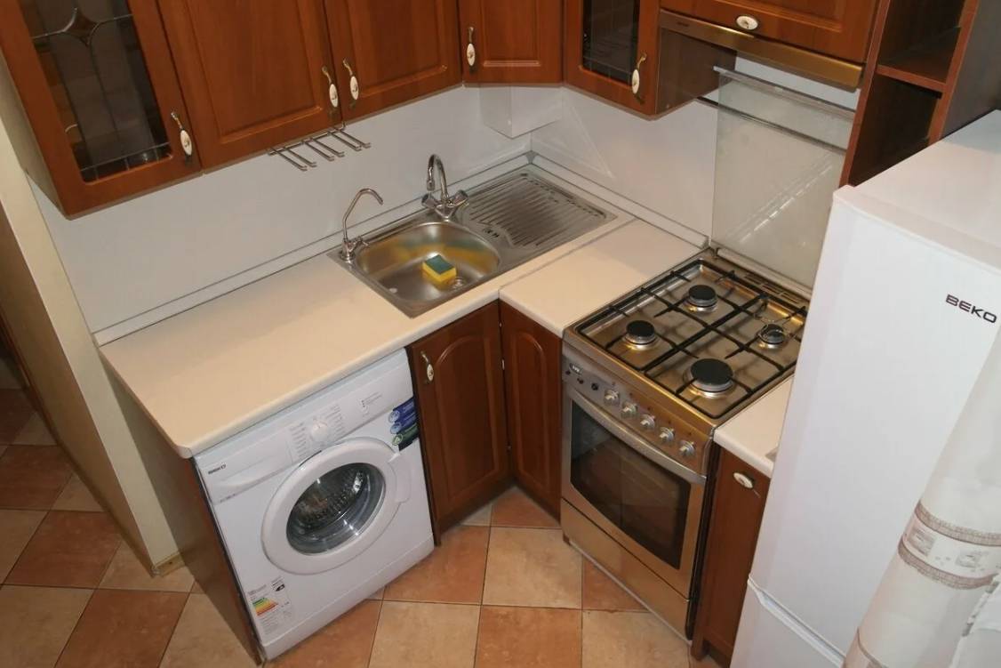 Если на кухне стоит машина для стирки, можно поставить рядом с ней газовую плиту. Однако будьте готовыми к тому, что стенки машинки будут желтеть от контакта с огнем. Чтобы этого не допустить, между стиралкой и газовой плитой должно быть расстояние не менее 2 см.