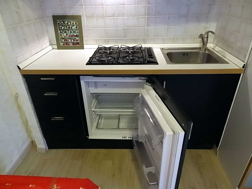 Холодильник – необходимый кухонный агрегат, который обычно занимает львиную долю места на кухне. Если есть возможность, его желательно перенести в коридор или на балкон. Взрослый работающий человек или пара без детей могут приобрести мини-холодильник или горизонтальный агрегат, который легко помещается в шкафчик или тумбу.