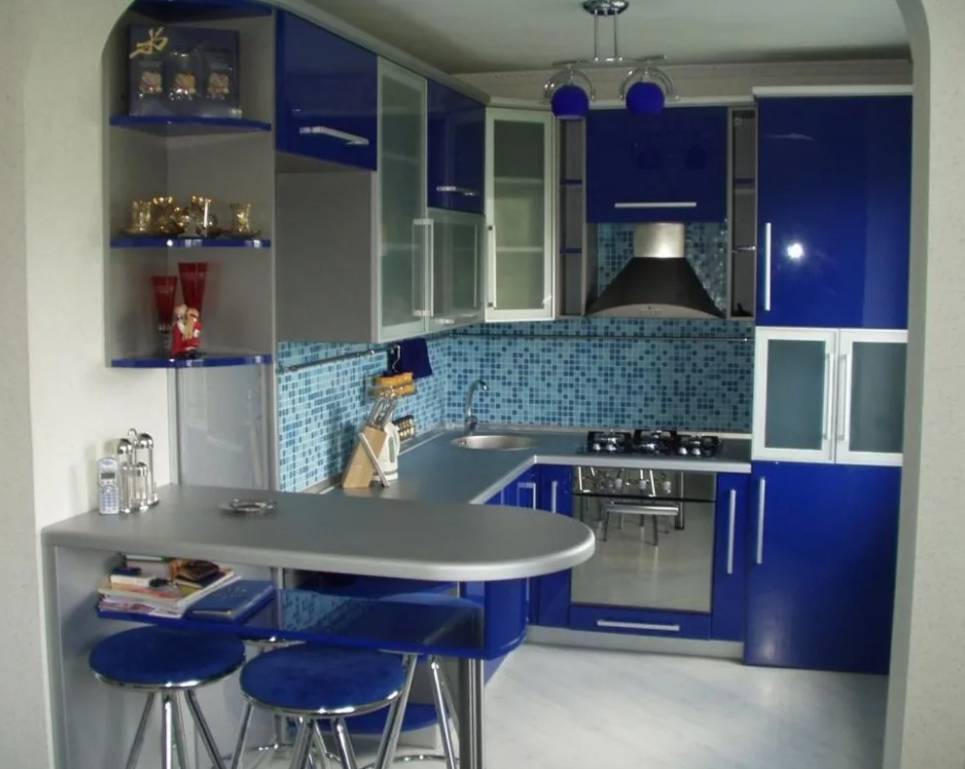 С барной стойкой. Данный вариант используется довольно редко, так как русские люди не привыкли к барным стойкам. Однако их применение считается прекрасным решением для маленькой кухни, располагающейся в хрущевке. С помощью стойки обеспечивается эффективное и легкое разделение одного пространства на две отдельные зоны: для готовки и для принятия пищи. Внутри гарнитура находится рабочая зона.