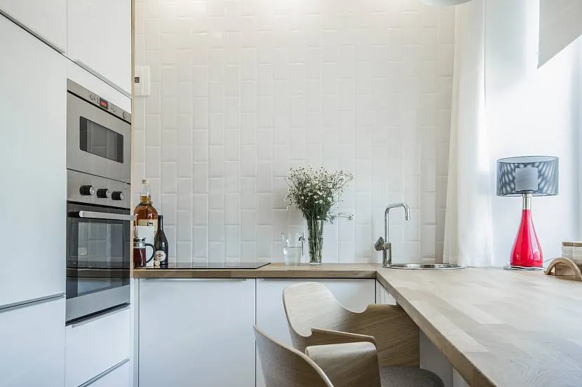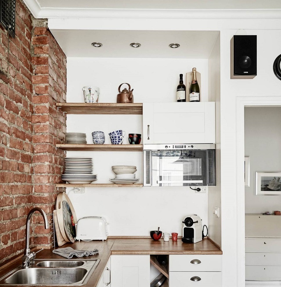 При этом будьте очень аккуратны с выбором фартука на рабочую поверхность. Не стоит выбирать нечто очень пёстрое и яркое, потому что стены белые. За счёт того, что площадь мала, этот небольшой отрезок, визуально, будет занимать существенную часть комнаты.