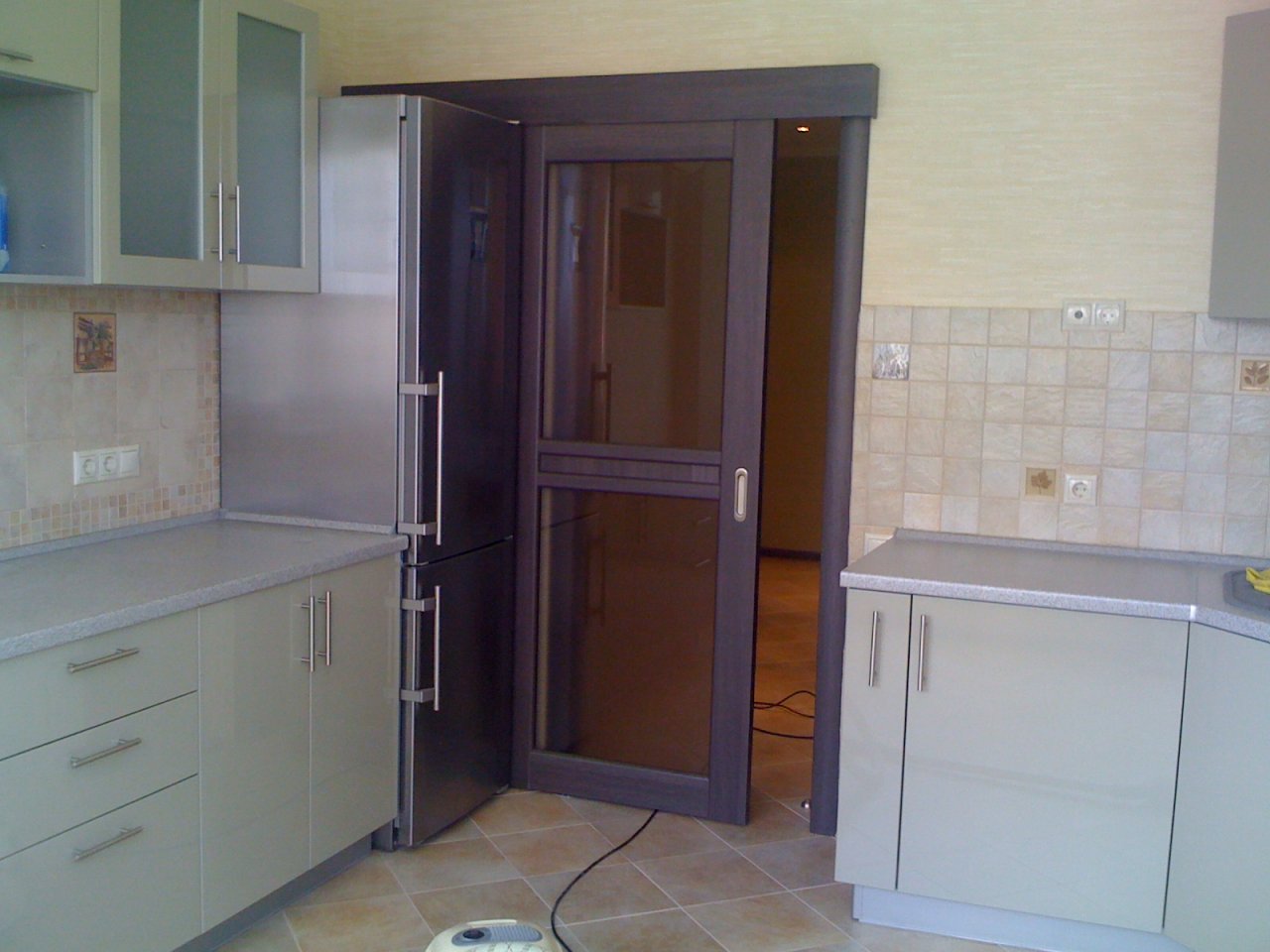 Традиционно размещают холодильник рядом с входом. Но тогда нужен демонтаж входной кухонной двери. В качестве альтернативы поставьте дверку, которая раздвигается в случае необходимости.
