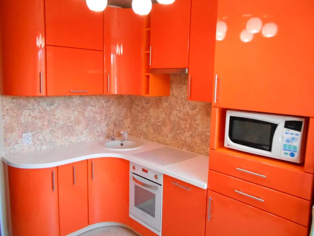 Для маленькой кухни угловое расположение разных предметов интерьера считается оптимальным решением. Такое размещение мебели и техники гарантирует существенную экономию пространства, что актуально для небольших помещений. При этом можно выбрать один из трех вариантов: