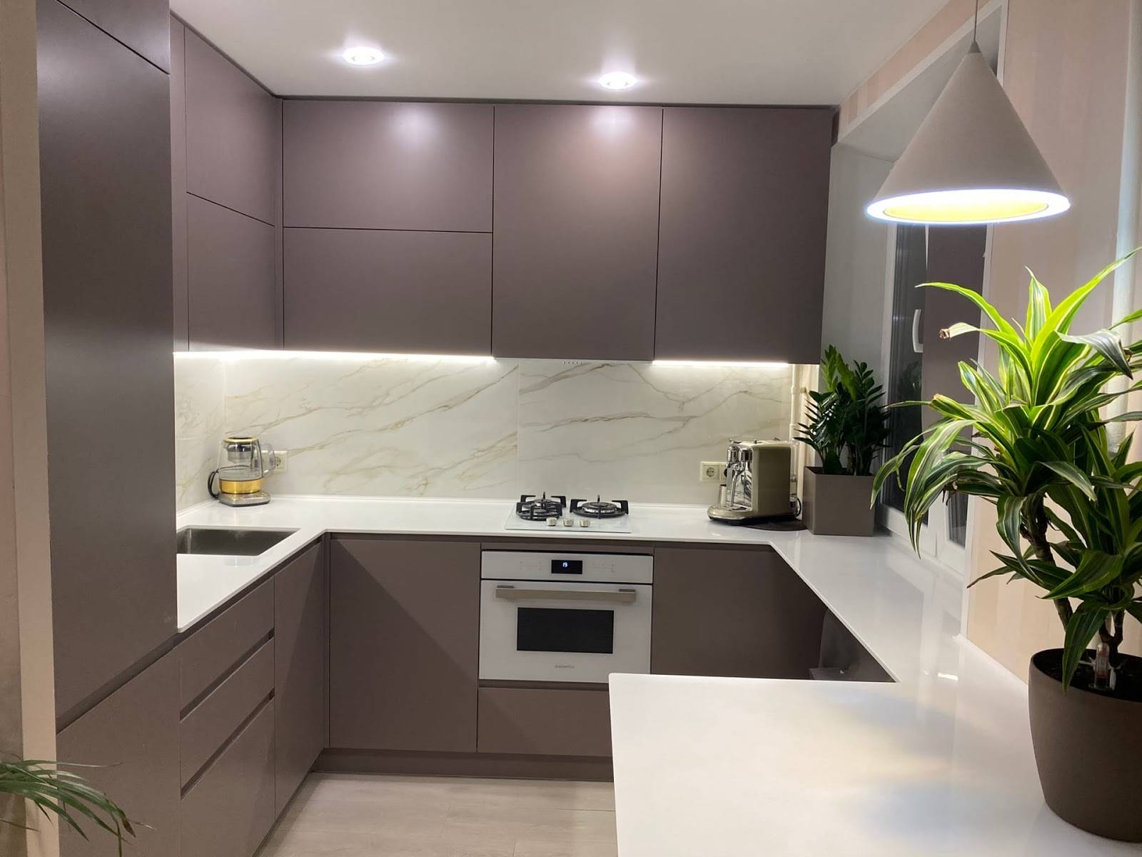 Г-образная планировка. Предполагает расположение всех элементов кухонного гарнитура и техники таким образом, чтобы все они находились вдоль перпендикулярных стен. В результате получается действительно компактное и универсальное помещение. В центре его остается довольно много свободного пространства, поэтому передвигаться по кухне будет легко и комфортно.
