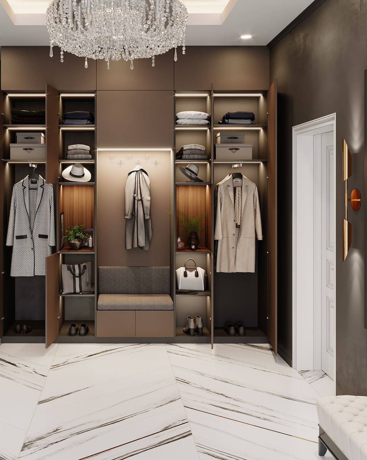 Шкафы могут быть встраиваемыми или корпусными. Корпусные, чаще всего стандартные по высоте, но могут достигать потолка и вмещать очень большое количество вещей. Линейная форма шкафов самая распространённая. Помогающая экономить площадь угловая конструкция может быть изящной радиусной формы.